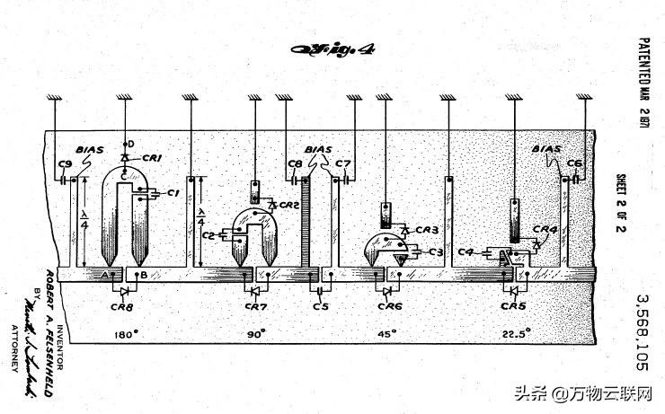 上图显示了一个微带移相器,大约在 1969 年,由 Robert Felsenheld 发明。当其他人在伍德斯托克裸泳并观看 Canned Heat 的 Alan Wilson 呱呱叫喊“Going up the Country”时,Felsenheld 在新泽西州纳特利的 ITT 工作并撰写这项专利。如果您想跟踪这一历史事件就知道,ITT Nutley 的剩余部分现在是 Harris 的一部分。移相器是一个四位数字单元,使用开关串联线。它可能提供比频率上的恒定相移更多的真实时间延迟,但是您必须分析当二极管 CR1 和 CR8 接通时路径 ACB 对主路径的负载影响。关于图像的一个有趣的事情是绘图员没有理解电容C6、C7、C8和C9必须与二极管直流偏置线并联,而不是串联。这些电容器需要接地以形成射频接地,从而阻止信号从控制线中逸出。当时没有表面贴装部件,因此轴向引线电容器(可能是 10 或 100 pF)将一根引线焊接到走线上,另一根引线穿过板上的钻孔并焊接到背面(带引线尽可能剪短!)也可以使用四分之一波长开路短截线制作射频接地,以避免不得不钻孔。感谢威廉询问如何连接电容器。 Felsenheld 毕业于拉斐特学院,后来成立了一家制造商代表公司;他于 2015 年去世。艾伦·威尔逊在过量服用巴比妥类药物后于 1970 年去世,享年 27 岁。工程师的寿命通常比音乐家长得多,这使得 IEEE 可以向会员提供较低的人寿保险费。嘿,这几乎听起来像是他们付钱给我们做广告!