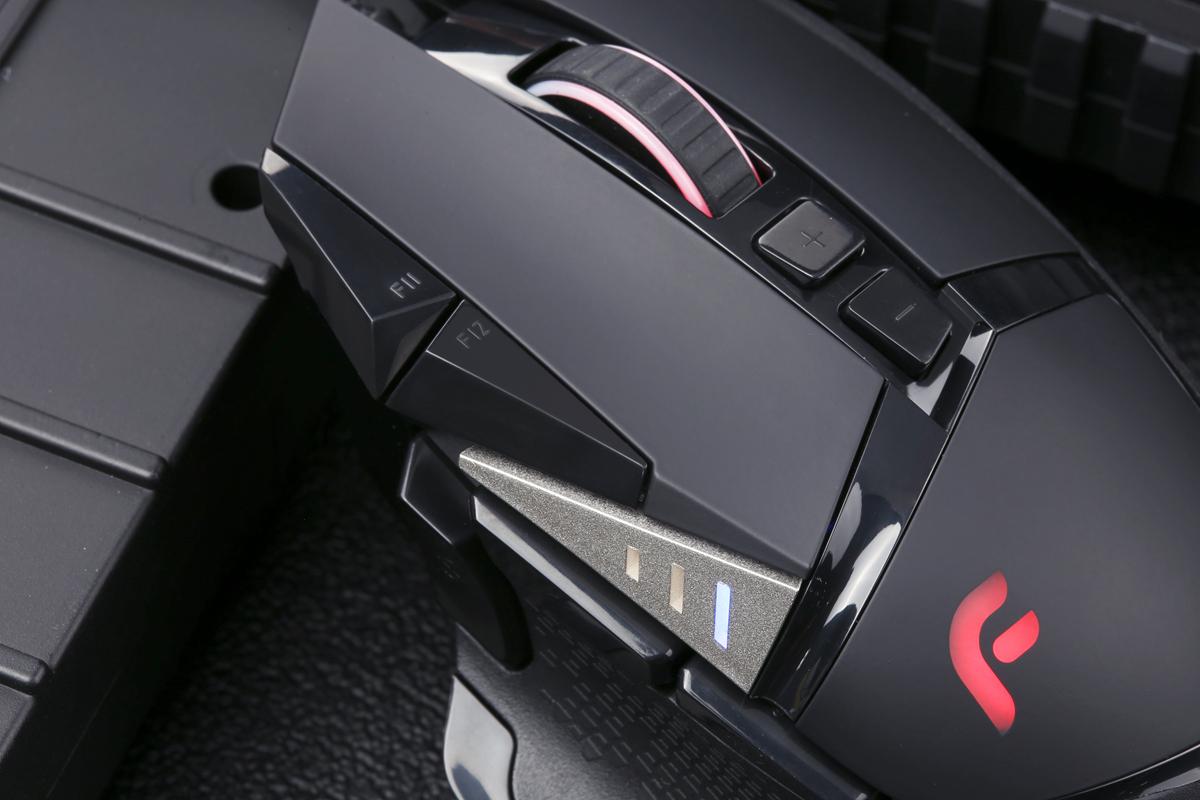 以迪摩F35为例,游戏鼠标最好是两个DPI键,一个加一个减切换的时候更快,比起单DPI键循环切换的好。一般来说,鼠标滚轮和logo的背光都是对应DPI档位的,多留意一下就很好分辨了。