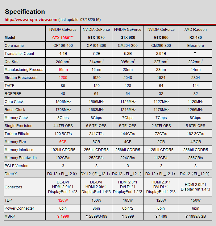 GTX 1060的具体规格可看下表: