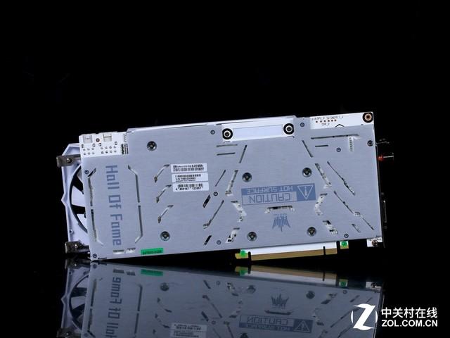 显卡整体采用白色为主色调,看起来非常的典雅高贵,显卡顶部是“Hall Of Fame”的信仰灯,可以通过影驰的魔盘软件调整为自己喜欢的颜色。显卡背部是银白色的背板,可以为显卡背面提供强效保护, 同时采用了更为优化的铝合金工艺,有效的加固显卡,同时背板采用了镂空设计,提高散热效能。