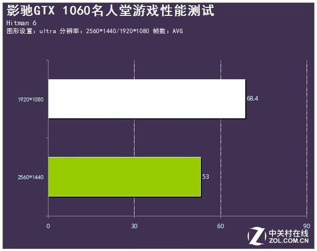 《杀手6》这款游戏中包括很多对多人大场面的描写,对显卡的要求比较高。可以看出,影驰GTX 1060名人堂在1080p下平均帧数达到了68帧,可以完美运行该作,而2K下的帧数为53帧,也可以较为流畅地运行游戏。