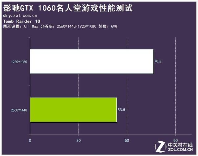 《古墓丽影:崛起》是年初推出的冒险类游戏,该游戏支持DX12。可以看出,影驰GTX 1060名人堂可以很好的支持DX12,在1080P分辨率下游戏帧数高达76.2帧,可以完美运行游戏;在2K分辨率下,游戏帧数有所下降但是也维持在53.6帧左右,可以较为流畅地进行游戏。