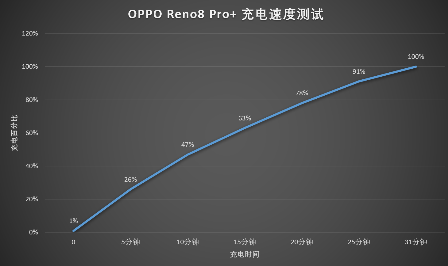 利用原装有线充电器 5 分钟可以从 1% 电量充至 26%、10 分钟可以充至 47%、15 分钟可以充至 63%、20 分钟可以充至 78%、25 分钟可以充至 91%,充至 100% 大概需要 31 分钟。就我个人的使用习惯来看,做到一天一充稍显吃力。好在充电速度比较快,能一定程度上缓解续航焦虑。