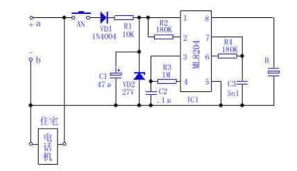 随着电话机的普及率越来越高,拥有住宅电话的家庭也越来越多,但大多数住宅电话使用率很低,利用电话入户馈线提供的48V(60V)直流馈电作电子门铃的工作能源是经济实用的。现介绍一款不用电池的双音门铃电路。电路原理如图所示,不难看出,图中电路是常规的电话机振铃电路的变型。a、b分别是电话机入户线的正、负两端。AN为常开型门铃按钮,在电话机候机时,按下AN,程控交换机提供的48V(或60V)电压,直流馈电经VD1、R1对电容C1充电,当C1端电压Vc达到IC1的起控电压时,IC1起振送出双音电子铃流使蜂鸣器B发声,告知主人有客来访。而当电话机正在使用时,则图中a、b之间的电压较低达不到IC1的起控电压,此时,即使按下AN门铃按钮也不工作,这是因为由于R1取值较大,远大于电话机的阻抗。故AN按下时对电话机的正常通话无影响。也对程控交换机无不良影响,仅在使用门铃时对其间打入的电话遇忙。