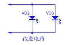 该电路也可用于防盗,将VT1栅极的接触线安装在门拉手或门锁等金属部位,当盗贼的手一接触即可报警。该电路经改动后可用于触摸儿童玩具。KD-482的E、E'两端原来是接蜂鸣陶瓷片的,如加以改进接上两只发光二极管VD2、VD3(如下图所示),而发光二极管VD1装在前额中间尤如三只眼,这样不仅集声.光、色于一体新颖有趣,而且更会招来儿童们的喜爱。其中VD1是用于来控制明暗的,VD2.VD3是随音乐声的大小而频频闪烁的。