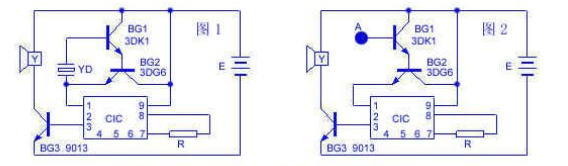 图2为触摸式。当用手指触摸电路A点时,人体感应电压使复合管BG1和BG2导通,音乐电路CIC受到触发即演奏一段乐曲。触摸电极A可用一大小适中的金属片固定在门框上即可。