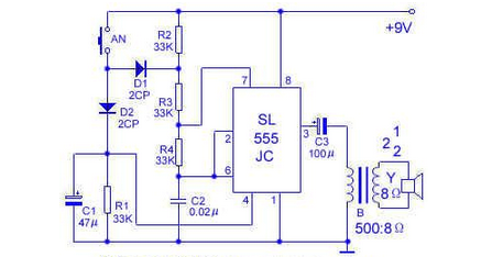 本文介绍一种采用时基集成电路构成的双音门铃,电路如下图所示,其核心部分是SL555时基电路。