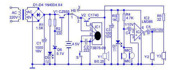 本对讲门铃由于音频放大器IC2(LM386)的增益很高,容易使Y2、Y3产生啸叫声。经笔者实际验证,只要在Y2、Y3两端并联一只几pF的小电容,啸叫声即可消除。