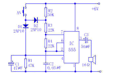 图中的IC便是时基电路集成块555,它构成无稳态多谐振荡器。按下按钮AN(装在门上),振荡器振荡,振荡频率约700Hz,扬声器发出“叮”的声音。与此同时,电源通过二极管D1给C1充电。放开按钮时,C1便通过电阻R1放电,维持振荡。但由于AN的断开,电阻R2被串入电路,使振荡频率有所改变,大约为500Hz左右,扬声器发出“咚”的声音。直到C1上电压放到不能维持555振荡为止。“咚”声的余音的长短可通过改变C1的数值来改变。