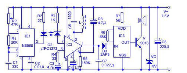 IC1选用NE555,IC2为μPC1373,IC3选用9300系列音乐集成电路。D1可用SE303A或LM66R型5mm圆形红外发光二极管,D2可用PH302方形红外接收二极管。V为9013NPN管,β≥100。B选用YD58--1型、8Ω/0.25W小口径扬声器。L用?0.08mm高强度漆包线,在小型晶体管收音机的中频变压器骨架上密绕30匝即可。