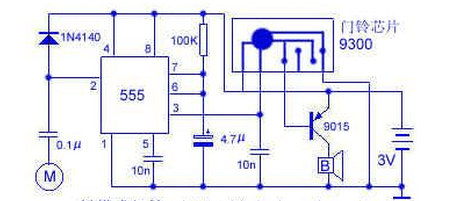 工作原理:电原理图如图所示。555时基集成电路工作在单稳状态,平时③脚和⑦脚均为低电平.当用手触摸一下金属感应片M时,人体的感应信号通过0.1μF电容加至555时基集成电路的②脚,使电路翻转进入暂稳态,这时③脚输出高电平直接加到门铃芯片的触发端,芯片被触发并通过三极管推动扬声器发声。同时⑦脚也变为高电平,电源通过100KΩ电阻对4.7μF电容充电,当电容上的电压充至2/3电源电压时,电路又翻转,暂稳态结束,③脚又变为低电平。待再触摸一次M时,上述工作过程周而复始。因此每触摸一次M,门铃就被触发一次。③脚上的0.01μF电容为抗干扰电容,可防止门铃被误触发。