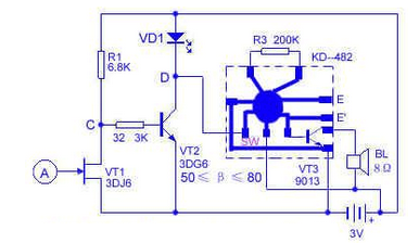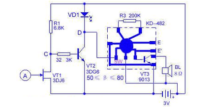 调试:电路按下图接好后,先将电源的负极与SW端用一根金属线短接一下(KD-482为低电平触发),BL放出音乐即可。控制电路只稍加调整,未触摸A之前,将万用表打在直流1V档位,测量VT2的基极b与发射极e两端电压应小于0.7V,然后再用手轻触A,此时指针指示要大于或等于0.7V。如达不到该值,可适当改变一下R2或R3的阻值,两个电阻最好配合调整。