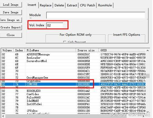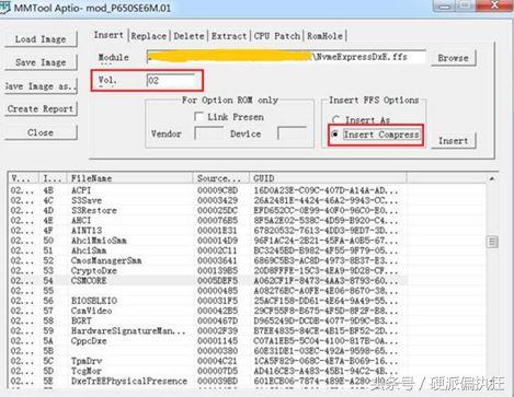 检查Vol.Index里的数字和第2步的CSMCORE的一样.我的主板BIOS是02,这一步也必须是02。一定要选择Insert Compressed,点Insert。