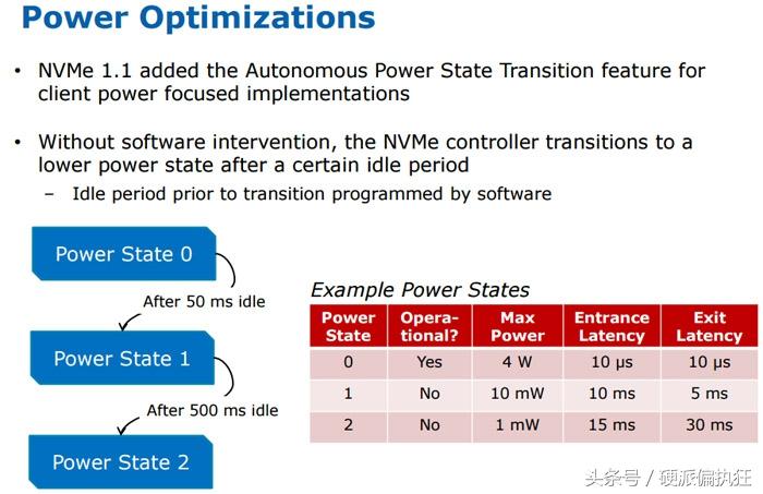 NVMe加入了自动功耗状态切换和动态能耗管理功能,设备从Power State 0闲置50ms后可以切换到Power State 1,继续闲置的话,在500ms后又会进入功耗更低的Power State 2,切换时会有短暂延迟。SSD在闲置时可以非常快速的控制在极低的水平,在功耗管理上NVMe标准的SSD会比现在主流的AHCI SSD拥有较大优势,这一点对移动设备来说尤其重要,可以显著增加笔记本和平板电脑的续航能力。