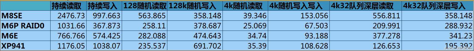 结果还是差不多,持续写入方面,M8SE基本上达到前行者的一倍。而持续写入受限于容量(M6P 256GB组Riad以后变成512,XP941也是512GB),提升远没有读取那么大,但是同样还是毫无争议性的超越