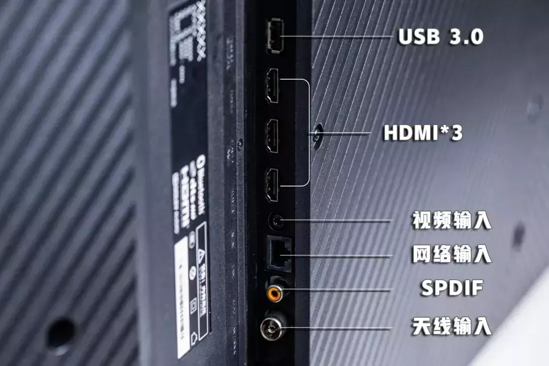 在后侧的凸起两侧各有一排散热格栅。USB 3.0、HDMI*3、视频输入、网络输入、SPDIF、天线输入这些接口则是在左侧。
