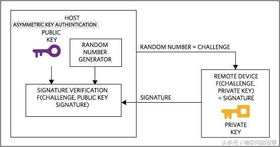 基于非对称加密的安全认证依赖于两个密钥:私钥和公钥。只有被认证的设备知道私钥,而公钥可透露给希望对设备进行安全认证的任何一方。与上文中讨论的方法一样,主机向设备发送质询。设备根据质询和私钥计算数字签名,并将其发送给主机(如下图)。但此时,主机使用公钥对数字签名进行验证。用于计算数字签名的函数拥有特定数学属性至关重要。非对称方法中最常用的函数是RSA和ECDSA。同样,设备也在不泄露密钥情况下提交了自己知道密钥的证明,即私钥。