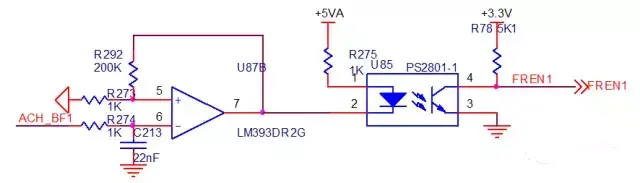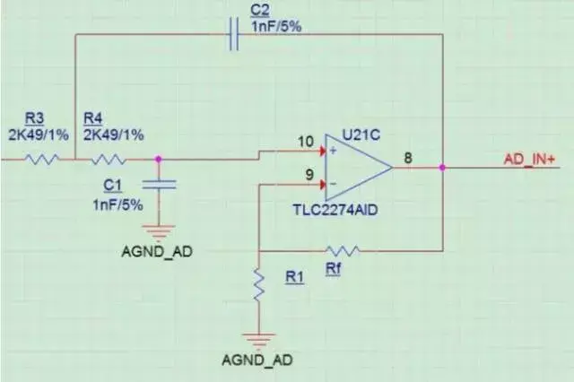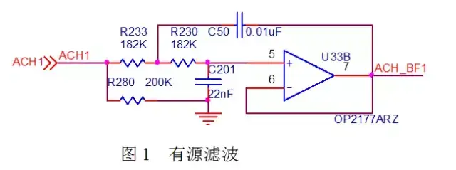 该电路的设计要点是:在满足合适的截止频率的条件下,尽可能将R233和R230的阻值选一致,C50和C201的容量大小选取一致(两级RC电路的电阻、电容值相等时,叫赛伦凯电路),这样就可以在满足滤波性能的情况下,将器件的种类归一化。其中电阻R280是防止输入悬空,会导致运放输出异常。