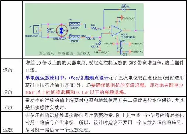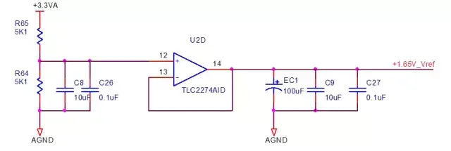 具体应用如下图:运放为单+5V_AD供电,AD芯片的电压是3.3V(基准电压芯片REF3033得到),该3.3V再电阻分压和经过运放跟随后得到1.65V,给到运放的同相输入端