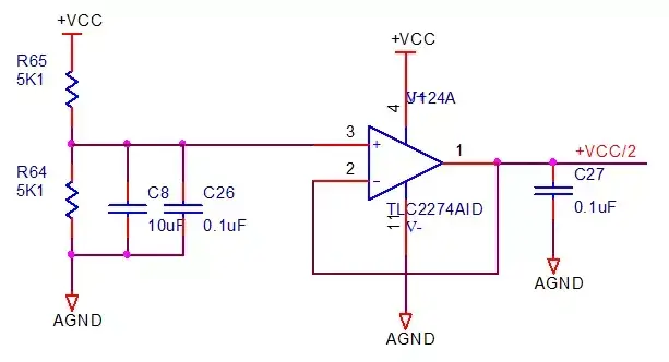 首先我们运用运放跟随电路,实现一个VCC/2的分压:
