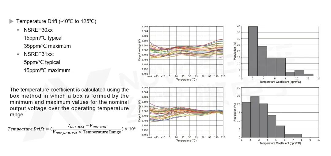 温度漂移是电压基准源最重要的参数之一,它是由电路缺陷和非线性引起的漂移,往往是非线性的。纳芯微电压基准源采用了黑盒法(Box method)对温度漂移进行测量和标定。