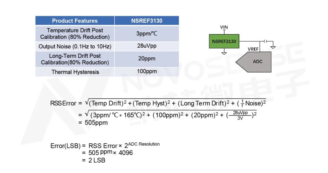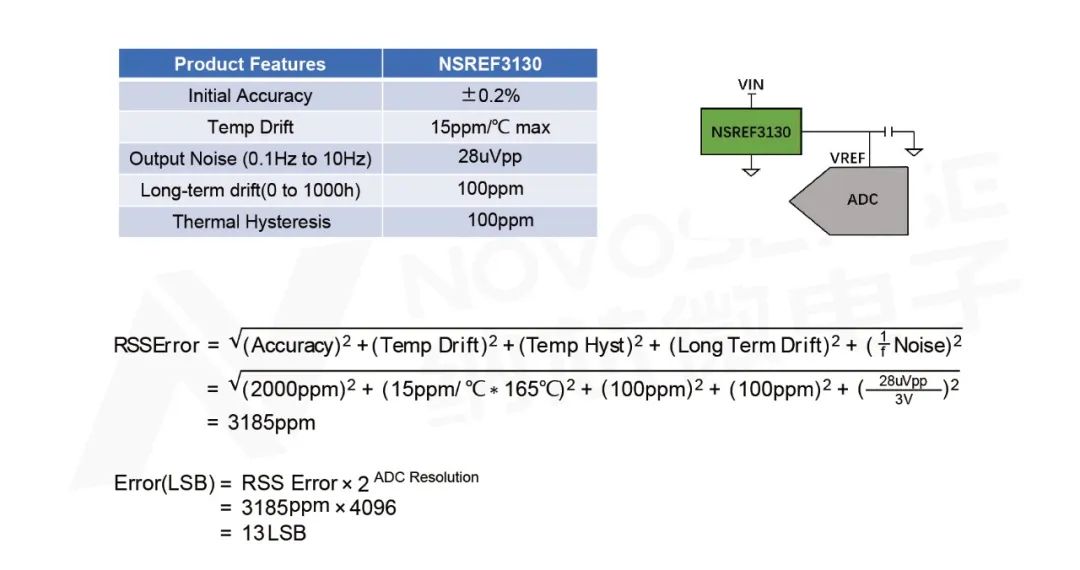 结合上述介绍的性能指标,以NSREF3130为例,分析其性能对ADC采集系统的影响。系统误差通常使用统计公差分析的平方根(RSS)法来计算。表格统计了NSREF3130的误差项及误差大小,方程式展示了使用平方根法计算的总误差,并将基准源总误差转换为LSB。本例省略了线性调整率、负载调整率等误差。由方程式得出,对于12位ADC, NSREF3130的误差贡献为13LSB。
