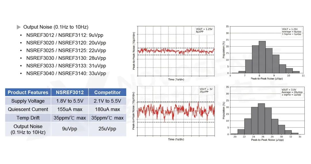 对比表明,在近似的静态功耗和温漂性能下,NSREF30/31xx系列产品的低频1/f噪声远低于市面上主流产品。