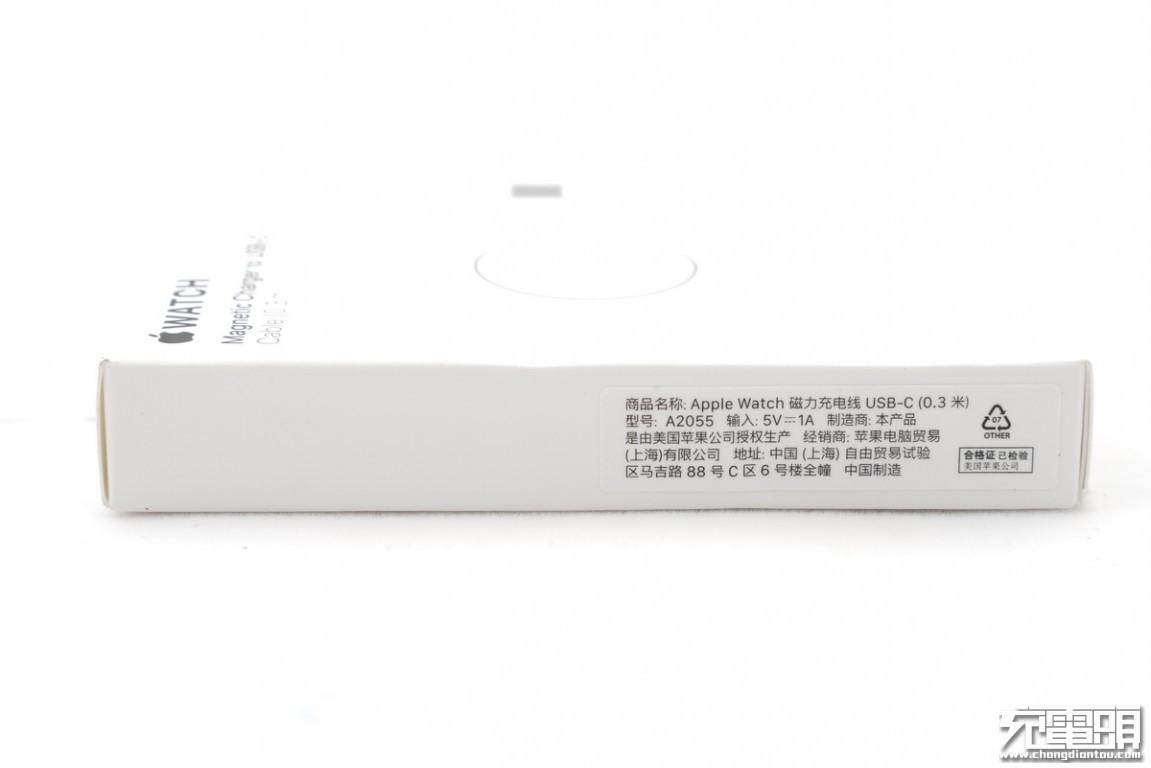 侧面是参数印刷,商品名称 Apple Watch 磁力充电线 USB-C,型号 A2055,支持5V1A输入。