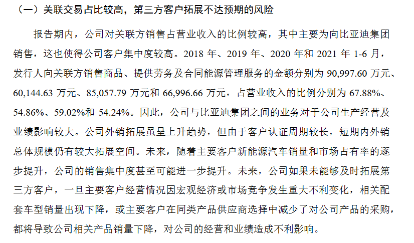 根据比亚迪半导体的招股书显示,2018 年、2019 年和 2020年,比亚迪半导体向关联方的销售金额分别为9.1亿元、6.01亿元和 8.51亿元,占营收比例分别为 67.88%、54.86%和59.02%。