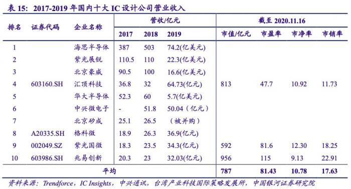 (附图:银河证券统计2017-2019年国内前十大IC设计公司收入排名)