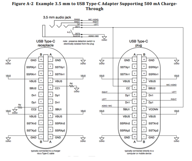 市面上部分采用USB Type-C接口的手机其实通过Type-C接口输出模拟信号 ,根据Type-C接口的定义,支持CC针脚检测到特定阻值的电阻时就会将Dp1、Dn1作为左右声道输出模拟信号,将SBU1作为麦克风输入模拟信号。