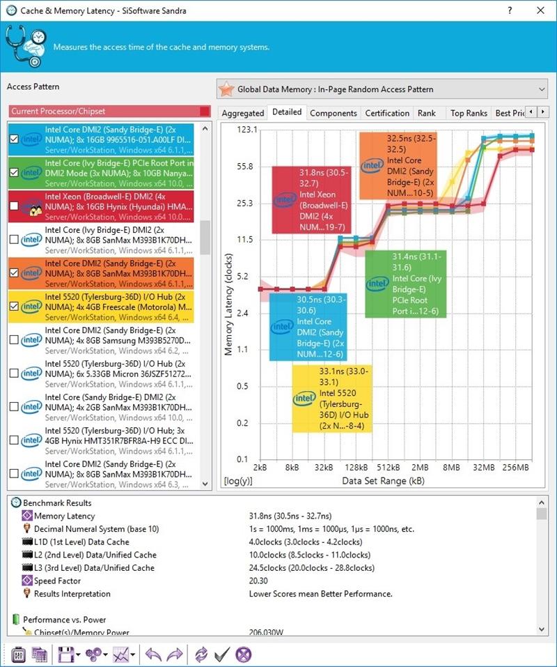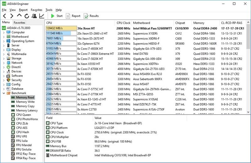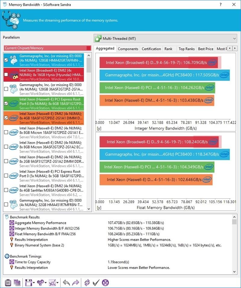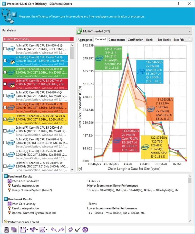 E5-2697 v4的带宽高达116-139GB/s,始终高居榜首。
