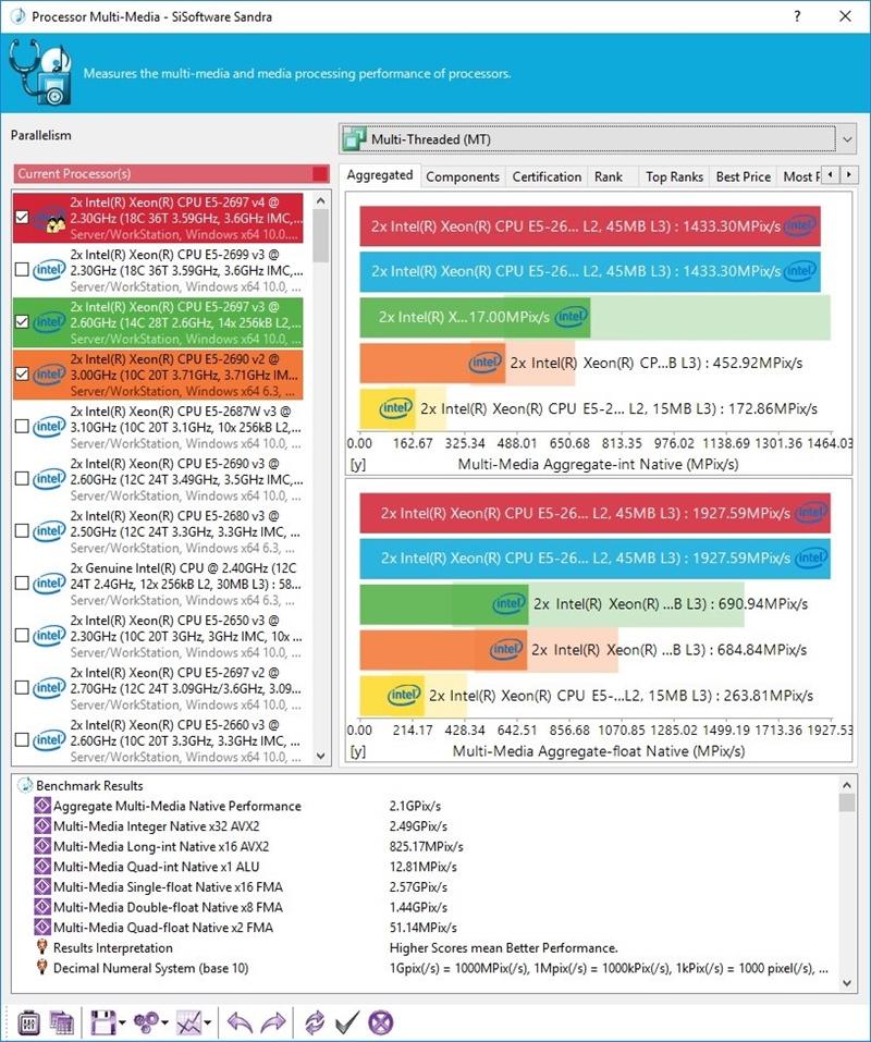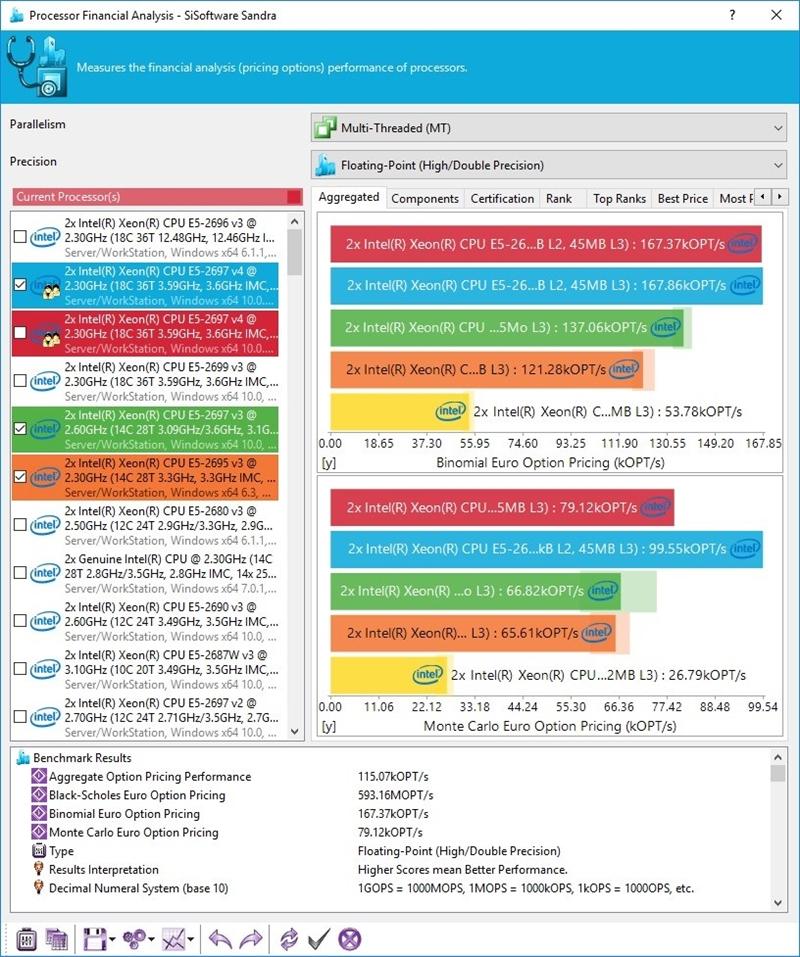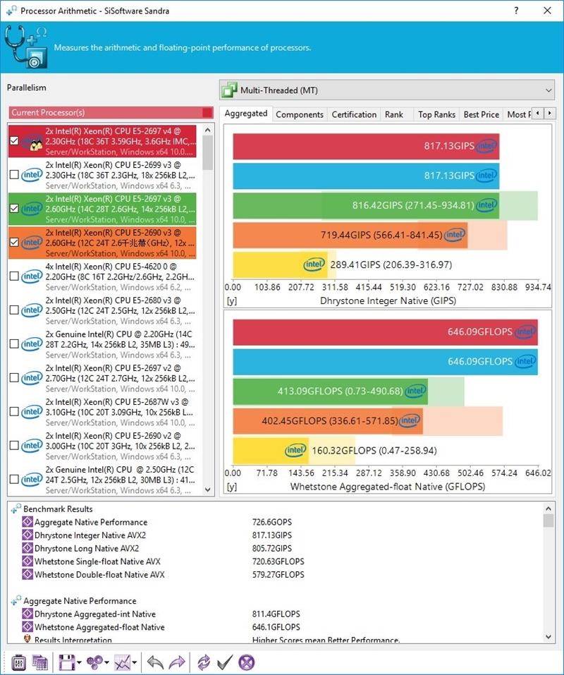 处理器算术性能:2697 v4和2699 v3完全相同,稍稍领先2697 v3。