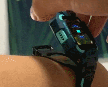 闪绿配色,具体可以解释为,部分的绿色和蓝色组合成的颜色,很显然这款手表是主要给男孩子们使用的,手表的设计很有机械感与科技感,棱角分明。Z6正面是一块1.41英寸的AMOLED屏幕,320*360的分辨率,像素密度(PPI)达342,为康宁大猩猩玻璃,防护性自然没得说,还有低蓝光护眼效果,是非常适合孩子使用的一块屏幕。