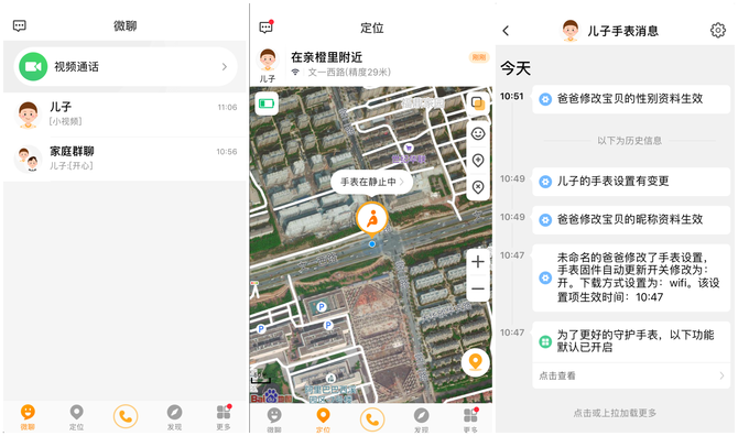 绑定好手表以后进入APP主页就可以看到群聊,在手表和绑定者手机之间可以建立微聊,不论是个人微聊还是家庭群聊,都可以在APP和手表上任意发送信息交流。