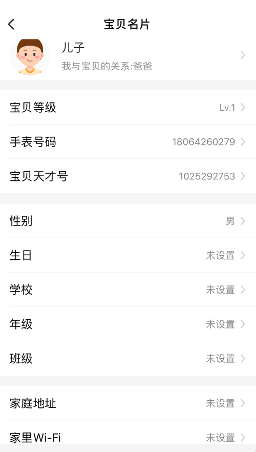 手表的许多具体设置都在更多里面,通过动图大家可以基本了解一下具体选项。在宝贝名片里可以对宝贝的具体生日和学校年级班级等设置,还有家庭地址与家里的WIFI信息。
