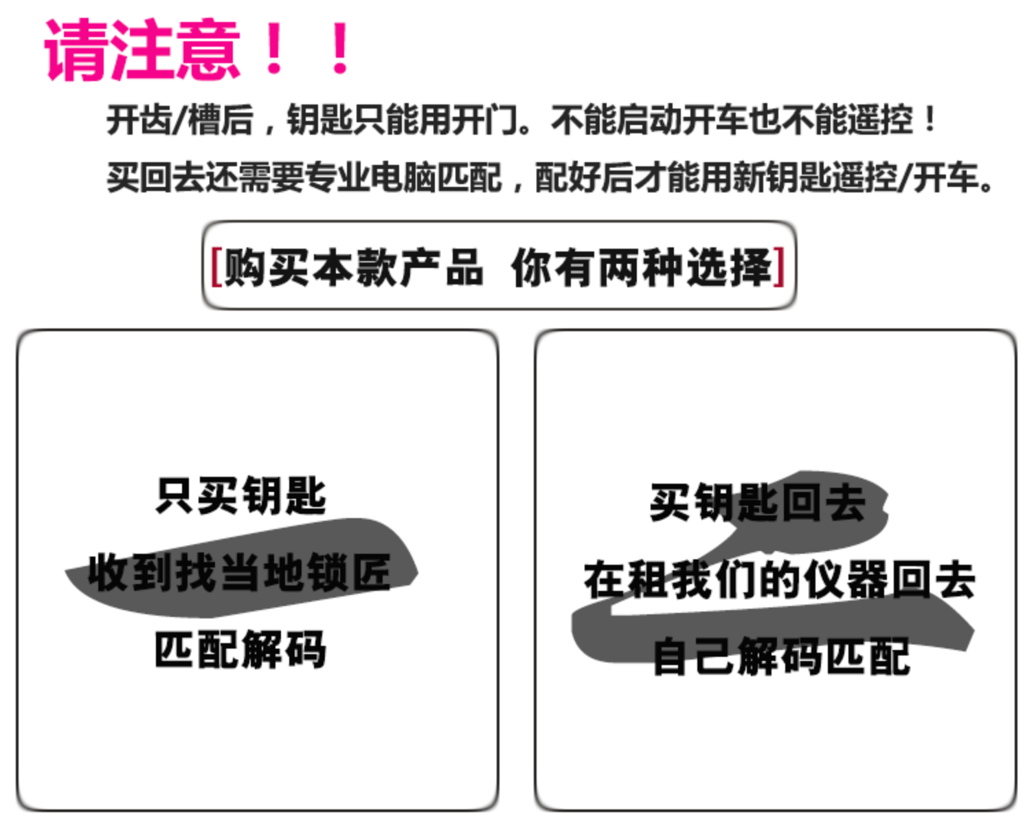 汽车钥匙也分为有芯片和没芯片的。如果是没芯片的钥匙,打开车门就能直接把车开走。而现在市面上大部分汽车都装有发动机防盗系统,都是有芯片的钥匙。在网店配钥匙最多只能配到钥匙的齿形,无法复制芯片。所以,有些网店还提供解码仪器的租赁服务,将仪器租回来后,自己就能复制出一把新的钥匙。