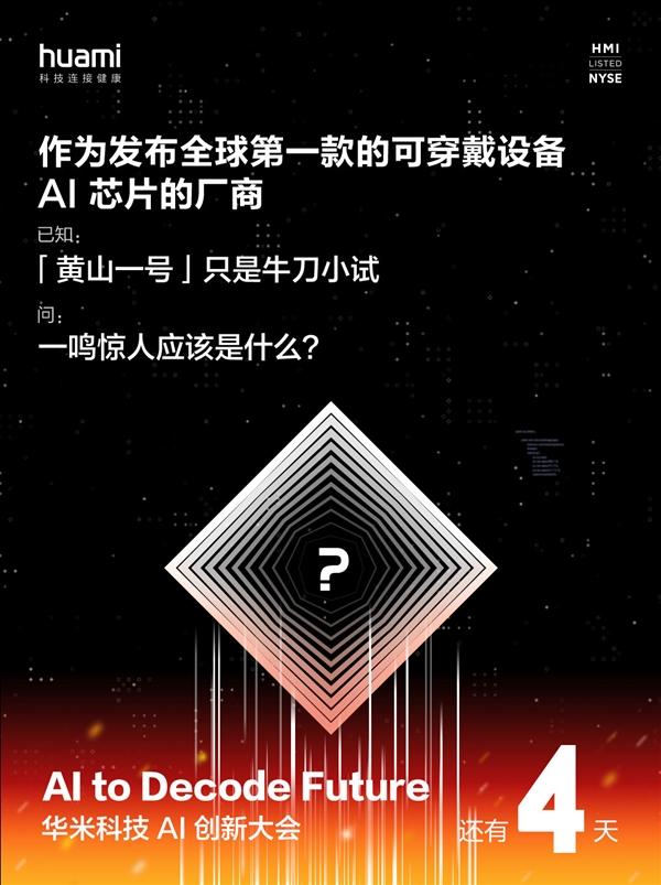 最新消息显示,华米将于6月15日举办的AI创新大会上,发布新一代可穿戴设备AI芯片。 今日,华米官方发布预热海报称,“黄山一号”只是牛刀小试,一鸣惊人应该是什么?