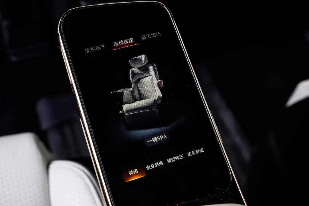 此外,第二排座椅配备了功能调节面板,可以进行座椅加热、通风、按摩等功能的选项,还支持一键SPA模式,只是按摩力度并不算强,对于缓解疲劳来说只能算是聊胜于无。此外,第二排座椅电动调节功还有提升空间,调节到合适位置后座椅还要自动要滑到固定位置进行锁死,从质感和舒适性的角度来看不如同级别的一些MPV车型。