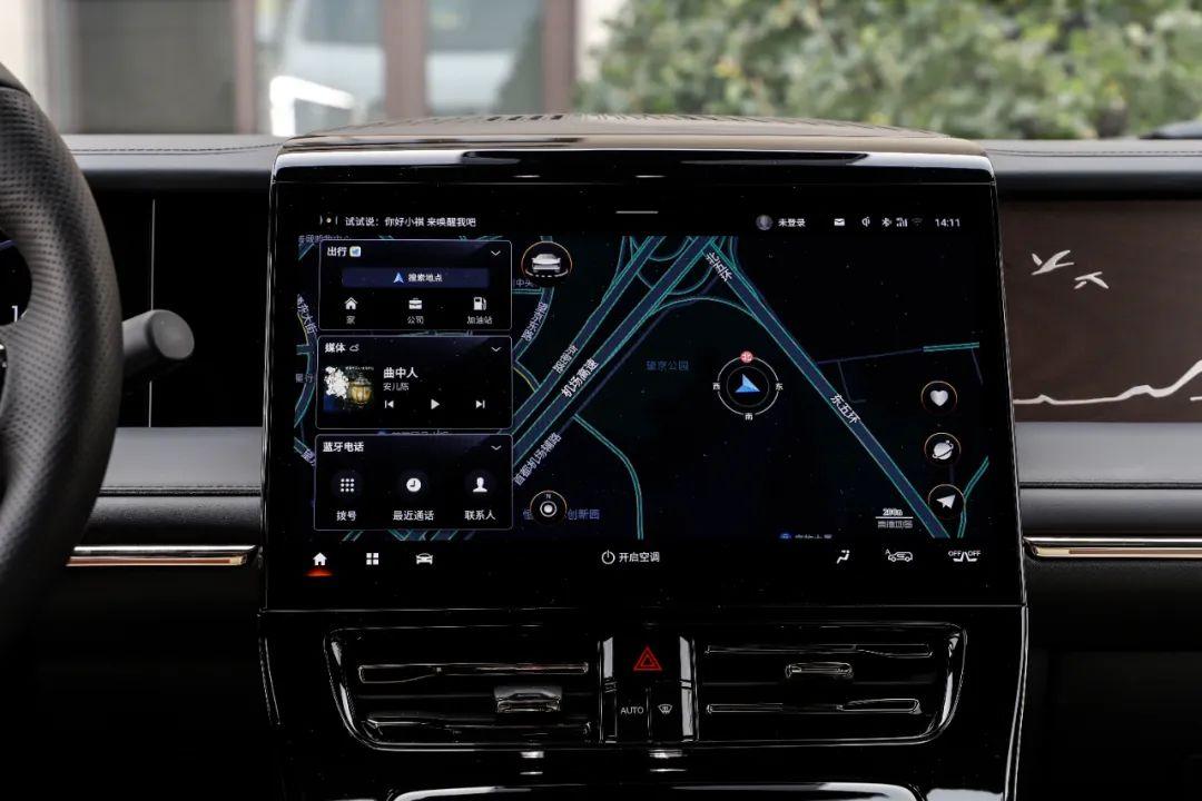 中控大屏尺寸提升到14.6英寸,车机采用高通骁龙8155车载芯片,内置最新的ADiGO智驾互联生态系统,包含车载导航、酷我音乐、喜马拉雅等拓展应用,导航地图的页面也可以投放到液晶仪表内。