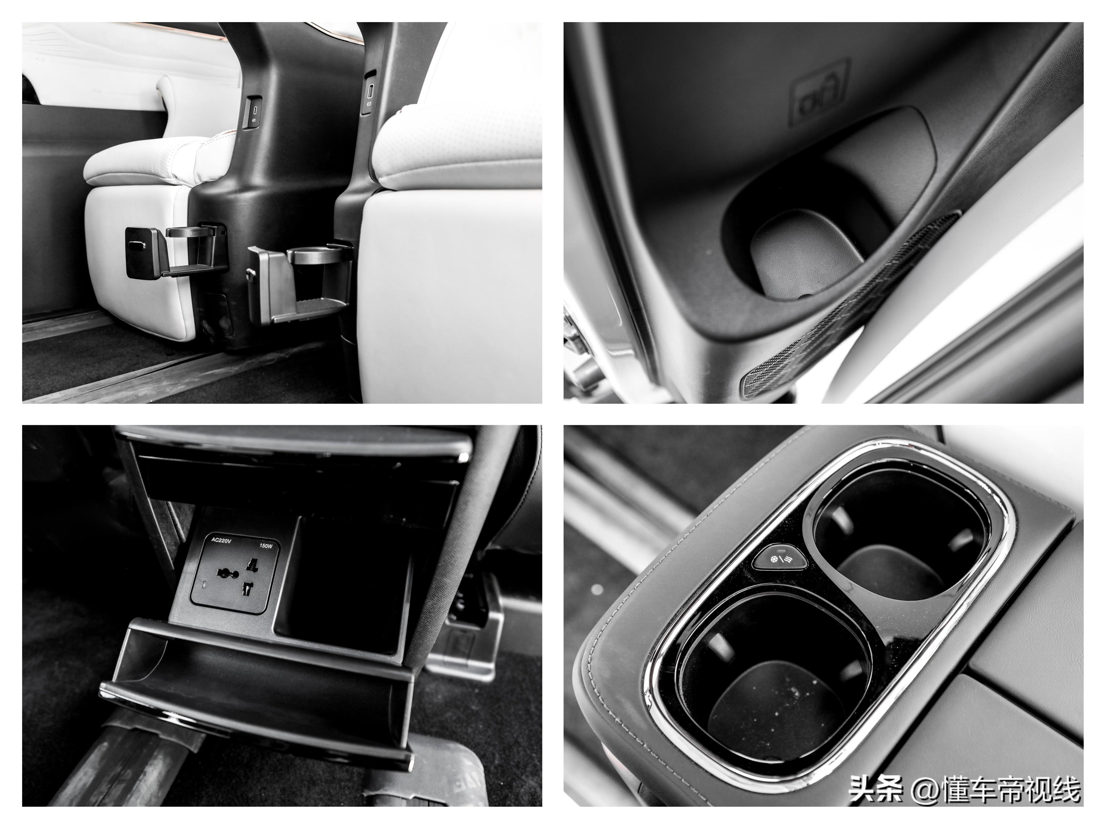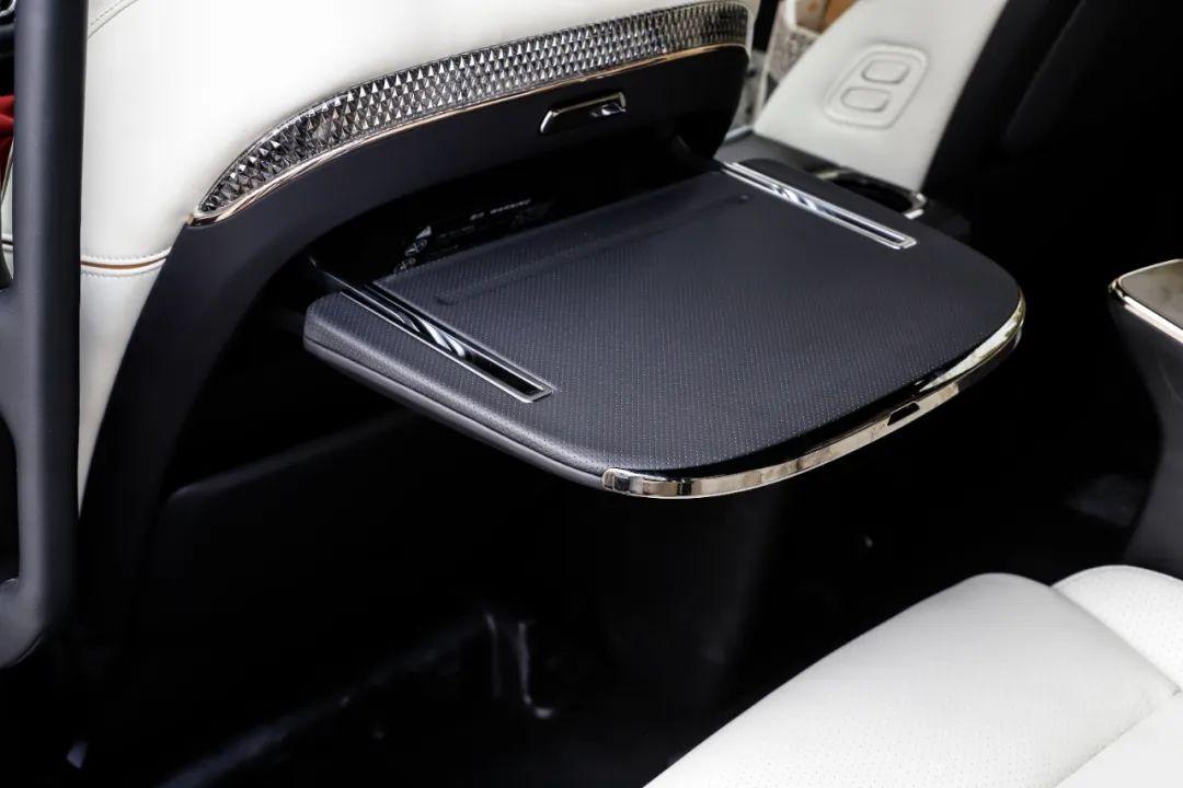 第二排储物表现延续了第一排的优点,尽管储物槽数量并不算多,但像手机、电脑、奶瓶等物品都能找到合适的地方存放,且杯架还有加热和制冷功能。实拍车型第二排小桌板打开后上翘明显,这一点官方人员解释与主驾驶靠背调节角度有关,不过即便如此,小桌板表面皮质并没有进行太多防滑处理,无论是办公还是在第二排带孩子多少会受到一些影响。