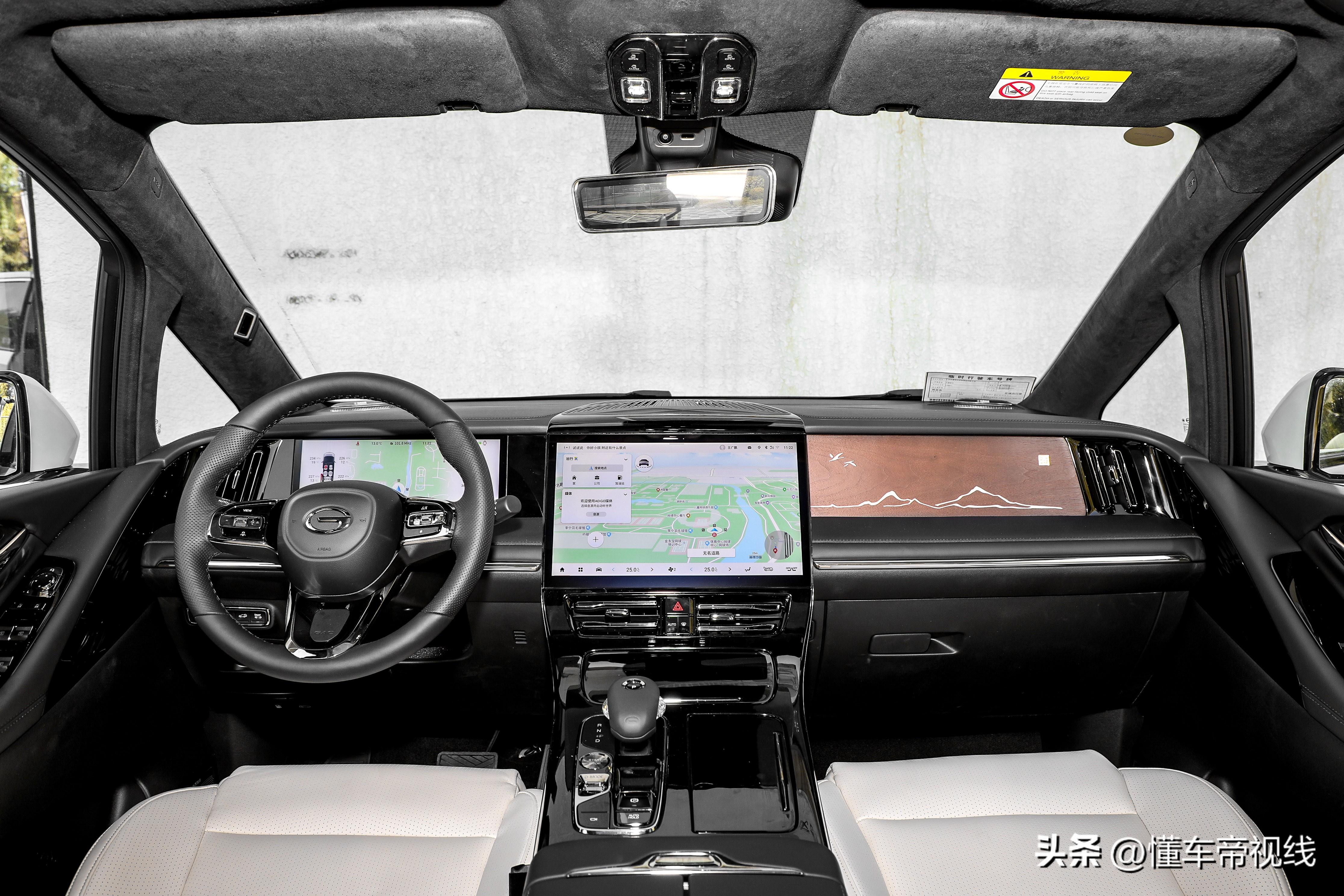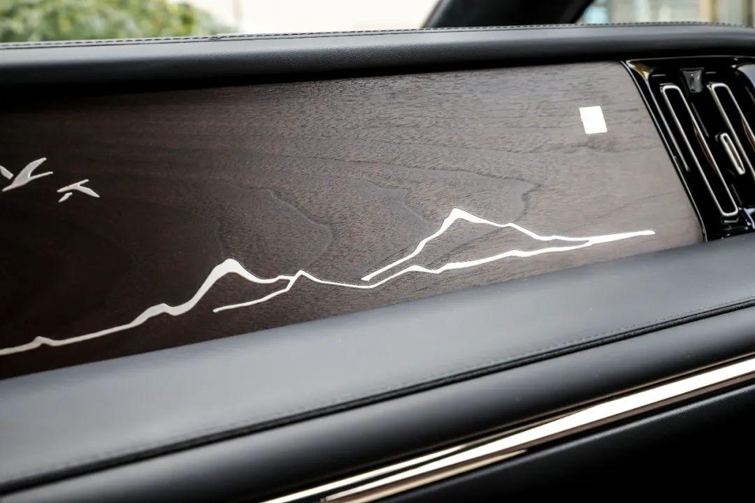 整个车内几乎找不到塑料材质,而是以大面积的真皮和搪塑工艺软质材料相辅相成,副驾驶前方还配备了一块北美黑胡桃木,“云山白鹭”的水墨画镶嵌其中,精致化效果尤为显著。