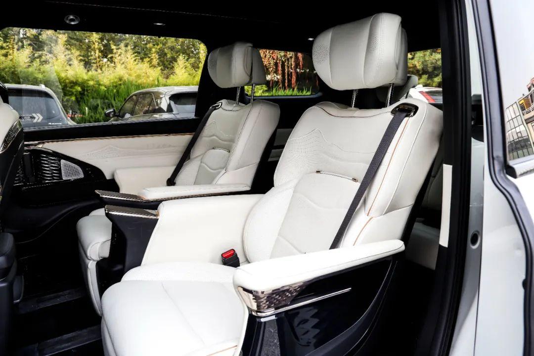 第二排拥有两个独立的航空座椅,采用低滞后软海绵+高回弹结构,材质选用半苯胺真皮,舒适度极佳。配置层面这台车也是足够的丰富,4向腿托调节、电动长滑轨、十点式气泵按摩、扶手屏、15.6英寸后排影音娱乐系统、通风和加热一应俱全,堪比头等舱。