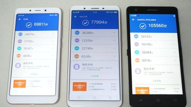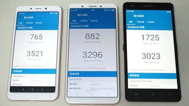 再来看与八核平台的比拼,图2可以看到,测试的机型,左边是红米6,搭载联发科MT6762平台,配置是4个2.0 GHz A53 + 4个1.5GHz A53;中间机型是vivo Y73,搭载高通骁龙439,也叫SDM439,是4个2.0GHz A53 + 4个1.5GHz A53;右边是虎贲T310样机。