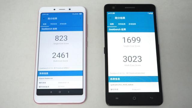 先看四核的比拼,左边的是红米6A,采用的是联发科MT6762M,配置是4颗Arm Cortex A53,主频2.0GHz;右边的是虎贲T310样机,配置是1颗2.0 GHz A75和3颗1.8 GHz A55。