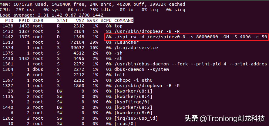 同时测得进行SPI读写速率测试时,CPU的占用率约为8%,如下图所示。