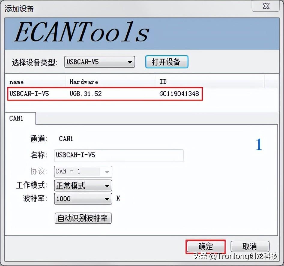 在PC端打开ECANTools软件,选择设备类型,然后点击“打开设备”。