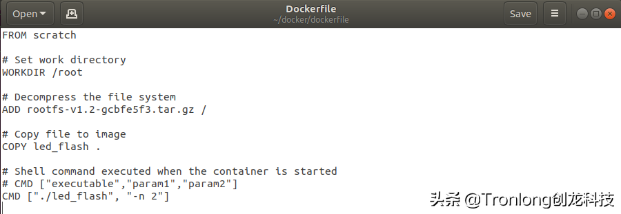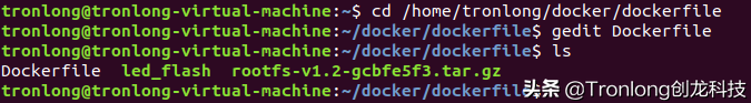 (3)构建镜像 新建Dockerfile文件。Host# cd /home/tronlong/docker/dockerfileHost# gedit Dockerfile