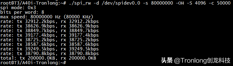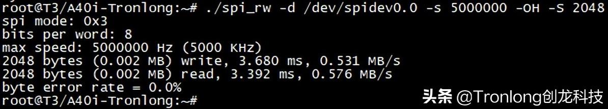 连接完成后,演示T3对FPGA BRAM的读写测试。读写功能测试。 执行如下命令运行程序,ARM通过SPI总线写入2KByte随机数到FPGA BRAM,然后读出数据、进行数据校验,同时打印SPI总线读写速率和误码率,如下图所示。Target# ./spi_rw -d /dev/spidev0.0 -s 5000000 -OH -S 20484
