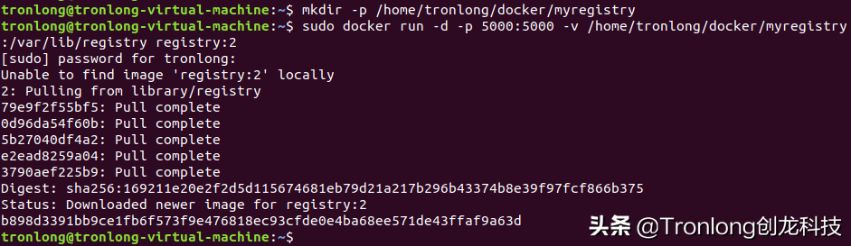 (2)搭建本地镜像仓库 Host# mkdir -p /home/tronlong/docker/myregistryHost# sudo docker run -d -p 5000:5000 -v /home/tronlong/docker/myregistry:/var/lib/registry registry:2